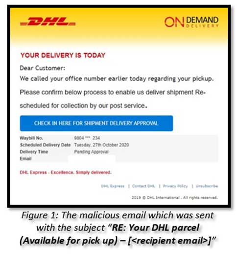 En noviembre se detectó un correo electrónico de phishing malicioso que usaba la marca de DHL que pretendía robar las contraseñas de los usuarios. El email que fue enviado desde la dirección de correo electrónico falsa Parcel.docs@dhl.com, contenía el asunto «RE: Su paquete de DHL (Disponible para recogida) – [<recipient email>]» con el email del usuario. El cibercriminal buscaba atraer a la víctima para que hiciera clic en un enlace malicioso, el cual redirigía al usuario a una página de inicio de sesión fraudulenta en la que debía teclear su contraseña, que luego se enviaría al sitio seleccionado por el cibercriminal (https://ipostagepay[.]ru/[.]mm0/)