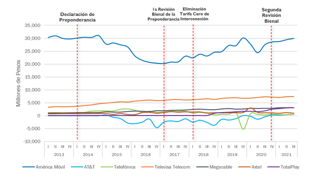 De acuerdo con estadísticas del propio IFT, al cuarto trimestre de 2020, el AEP-T ostenta una posición preponderante, es decir una participación de mercado superior a 50%, a nivel sectorial al detentar una proporción de 58.6% de los accesos o suscripciones a servicios de telecomunicaciones en México, tan sólo 1.5 puntos porcentuales (pp) menor a la registrada al mes de marzo de 2017, cuando se revisó por primera vez la regulación asimétrica que le es aplicable.