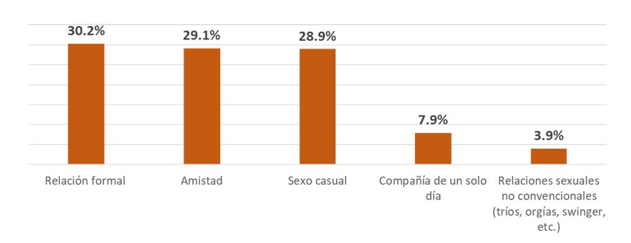 En general, 30.2% busca una relación formal, 29.1% una amistad y 28.9% solamente una aventura o sexo casual. Pero ligar con estas aplicaciones va más allá de solo crear una cuenta, existen otros factores muy importantes a considerar, es por eso por lo que, las personas que utilizan estas aplicaciones con la finalidad de tener sexo casual tienen una preferencia por la apariencia física y poco les interesan detalles como los intereses en común.