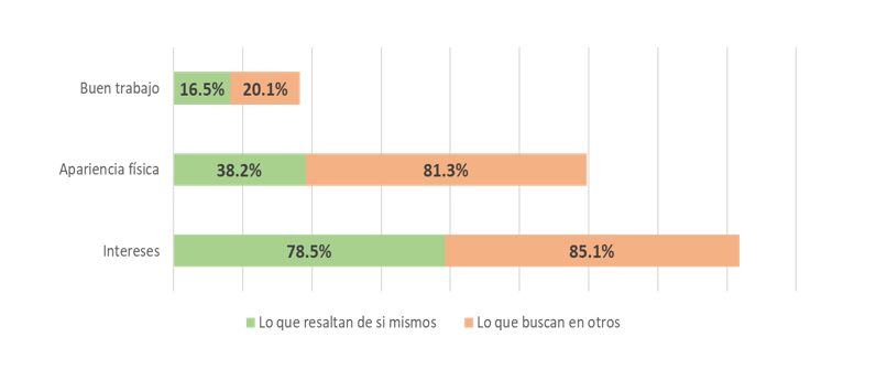 Al explorar el comportamiento de los usuarios de estas aplicaciones de ligue encontramos que dentro de lo que se busca destacar de uno mismo y lo que se busca en otros, es tener intereses en común (mencionada 8 de cada 10 veces), por encima de que sea alguien guapo/guapa o con buen físico, incluso por encima de buscar a alguien que tenga un buen trabajo.