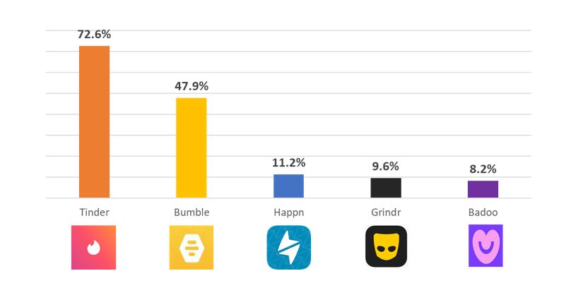 Tinder (72.6%) es la aplicación más conocida y popular del país. Dirigida al público en general y con más de 55 mil millones de “matches” a nivel mundial, esta aplicación lleva 7 años en el país operando de manera exitosa.