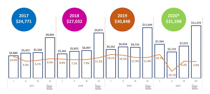 De esta manera, se estima que alcanzarán ingresos por $31,864 millones de pesos por la venta de equipos para los operadores móviles durante el último trimestre de 2020, cifra que representa 32.6% de los ingresos del año en su conjunto ($97,534 mdp.) o 3.0% más que un año atrás.