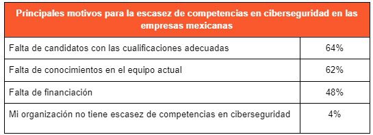 Sin embargo, la escasez de competencias en ciberseguridad afecta actualmente al 64% de las empresas mexicanas. A pesar de disponer de una mayor capacidad para captar talento a través de un modelo híbrido, para 5 de cada 10 organizaciones en el país, el mayor reto al que se enfrentan en materia de ciberseguridad es la falta de ciber profesionales calificados, como afirman también las empresas encuestadas en todo el mundo (59%).