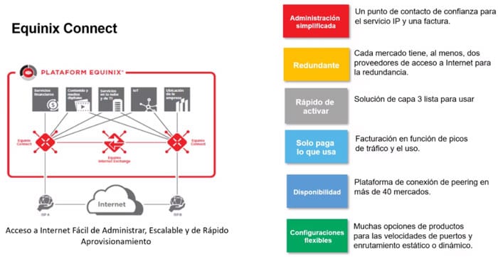 - Equinix Connect proporciona acceso a internet en los centros de datos IBX de Equinix con opciones de ancho de banda flexibles y aprovisionamiento rápido. Las interconexiones locales, incluyendo el peering de Internet de la Ciudad de México, ayudan a reducir la latencia.