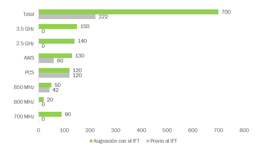 Durante el curso de su operación en materia de licitación y asignación del espectro radioeléctrico esencial para la operación de las telecomunicaciones móviles, el IFT ha generado pasar de 222 MHz a 700 MHz entre 2014 y 2020, esto es un nivel 3.2 veces superior.
