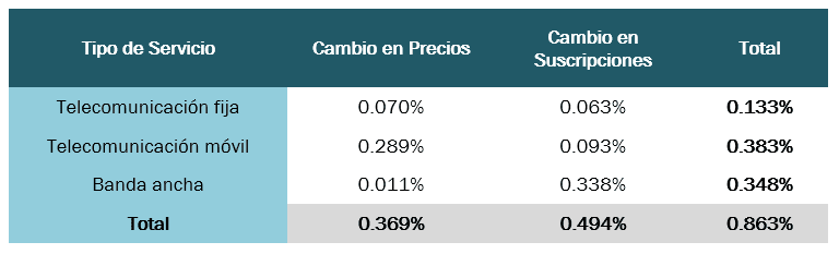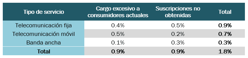 Entre estas pérdidas, 0.9% son atribuibles a los cargos excesivos a consumidores a los que proveen servicios y 0.9% por las suscripciones no alcanzadas precisamente, por las elevadas tarifas. Por servicio, 0.9% corresponde a las telecomunicaciones fijas, 0.7% a las telecomunicaciones móviles y 0.3% a la banda ancha.