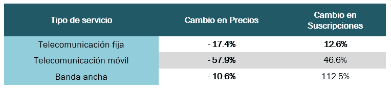 La contabilidad de acceso a servicios de telefonía fija aumentó 13.6%, banda ancha fija 57.6%, telefonía móvil 16.0%, banda ancha móvil 198.8% y televisión restringida 49.2%.