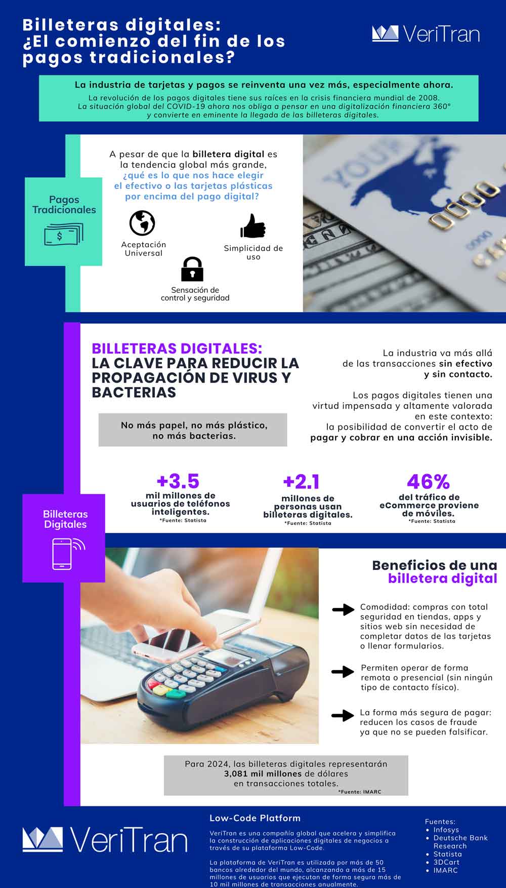 VeriTran a través de su plataforma de low code ofrece simplificar la construcción de billeteras digitales y otros canales para distintas empresas, colaborando con la industria financiera en el desarrollo de un ecosistema digital 360 grados, ofreciendo banca digital y distintas soluciones de pago.