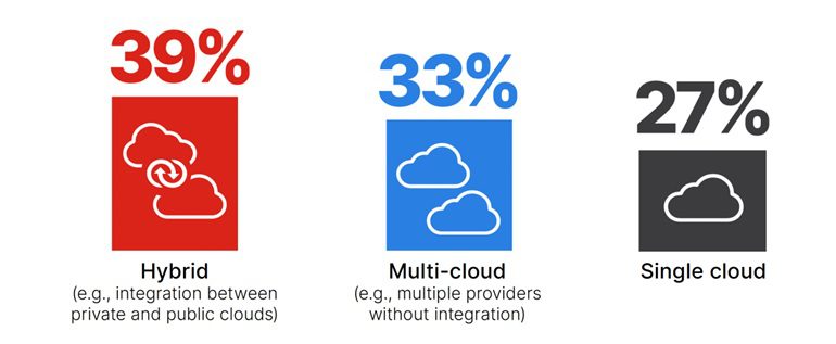 El informe también revela que, para integrar servicios variados, proporcionar escalabilidad o garantizar la continuidad del negocio, el 39% de las organizaciones está optando por un enfoque de despliegue de nube híbrida -un 3% más que el año pasado- o multicloud (33%).