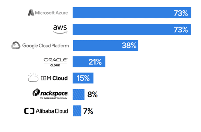 Actualmente, el 76% de las organizaciones utilizan dos o más proveedores de nube. AWS y Microsoft Azure lideran la lista empatados, aunque Google y Oracle están aumentando rápidamente sus inversiones y su cuota de mercado.