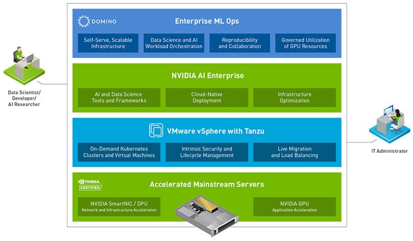 La versión 1.1 de NVIDIA AI Enterprise también proporciona validación para la plataforma MLOps empresarial de Domino Data Lab con VMware vSphere con Tanzu.