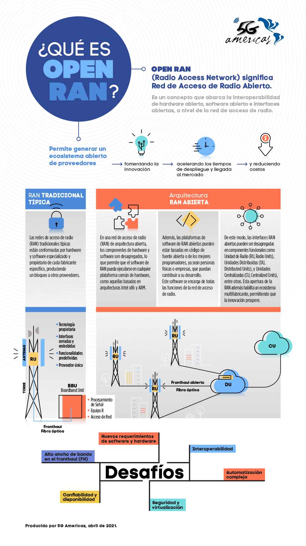 Esta apertura de la RAN además habilita un ecosistema multifabricante, permitiendo que la innovación prospere. Además, la estandarización apunta a incentivar economías de escala globales en las cadenas de suministro de proveedores de todo el mundo. Juntos, estandarización y apertura, prometen reducir los costos y acelerar la innovación para 5G.
