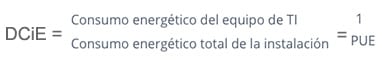 El recíproco de la PUE mide la eficiencia energética de un centro de datos. La eficiencia de la infraestructura del centro de datos (DCiE) es esa relación y puede ser calculada por medio de dos fórmulas: