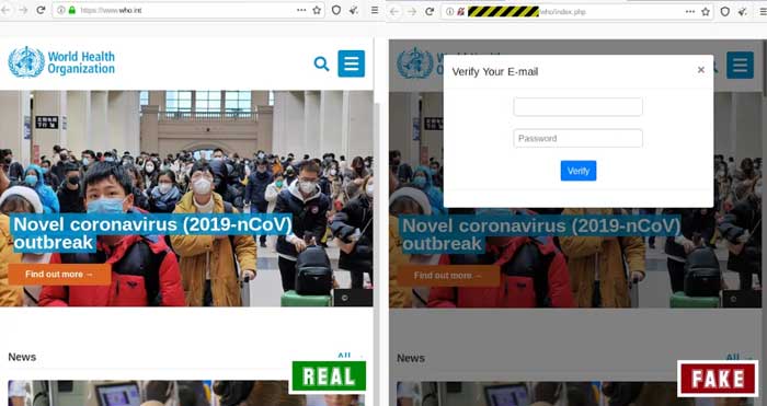 Este sitio web es una versión idéntica al sitio oficial de la OMS, con la diferencia de que al abrirlo aparece una ventana emergente que solicita al usuario su correo electrónico y la contraseña del mismo, para supuestamente dejarlo descargar el contenido.