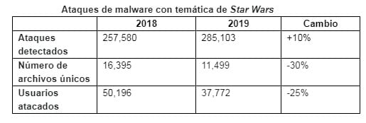 El phishing no es la única forma en que los ciberdelincuentes tienden a utilizar franquicias de películas famosas. Al igual que con los programas de televisión populares, a menudo disfrazan los programas maliciosos como otro episodio más de la historia. En 2019, Kaspersky detectó 285,103 intentos de infectar a 37,772 usuarios que buscaban ver películas de esta saga, lo que significa un aumento del 10% en comparación con el año pasado. El número de archivos únicos utilizados para atacar a los usuarios ascendió a 11,499, una caída del 30% con respecto al año pasado. Los datos muestran que incluso años después del estreno de la película, un número significativo de usuarios seguirá intentando bajar archivos maliciosos con la esperanza de ver gratis las famosas aventuras espaciales.